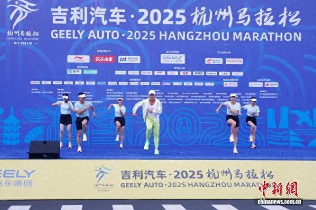 11月2日,2025杭州马拉松鸣枪开跑,3.2万人分别参加全程马拉松、半程马拉松项目。图为刘畊宏(左四)在舞台上带领跑友热身。中新社记者 肖健 摄