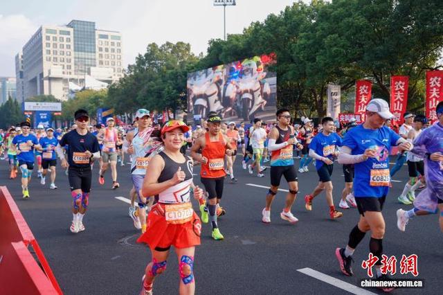 11月2日,2025杭州马拉松鸣枪开跑,3.2万人分别参加全程马拉松、半程马拉松项目。图为选手在比赛中出发。中新社记者 肖健 摄