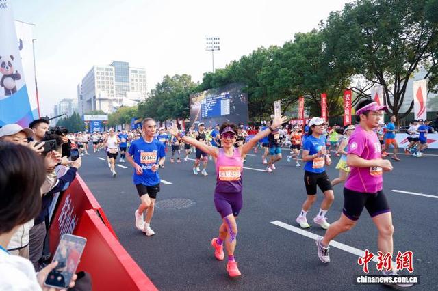 11月2日,2025杭州马拉松鸣枪开跑,3.2万人分别参加全程马拉松、半程马拉松项目。图为选手在比赛中。中新社记者 肖健 摄