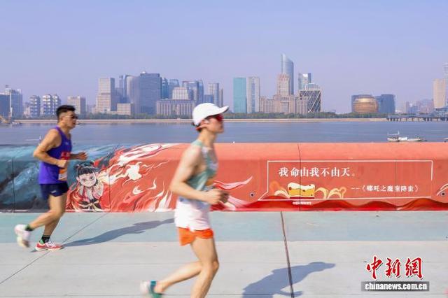 11月2日,2025杭州马拉松鸣枪开跑,3.2万人分别参加全程马拉松、半程马拉松项目。图为参赛选手在比赛中途经电影《哪吒之魔童降世》的主题彩绘。中新社记者 肖健 摄