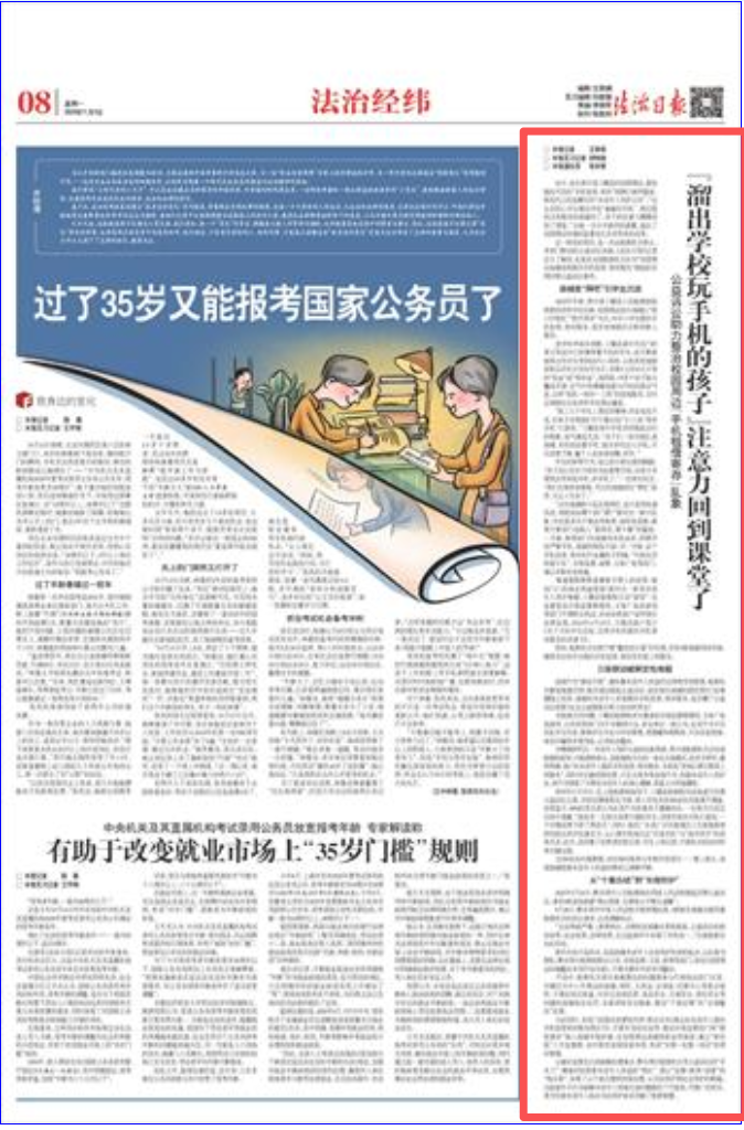 今天(11月3日),《法治日报》刊发新闻《“溜出学校玩手机的孩子”注意力回到课堂了 公益诉讼助力整治校园周边“手机租借寄存”乱象》。