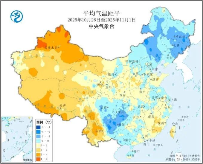 上周(10月26日至11月1日),内蒙古东部、东北地区中东部、西南地区东部等地平均气温较常年同期偏低1℃至4℃,新疆大部、甘肃西部、福建西部、云南中西部等地偏高1℃至4℃,其余大部地区气温接近常年。