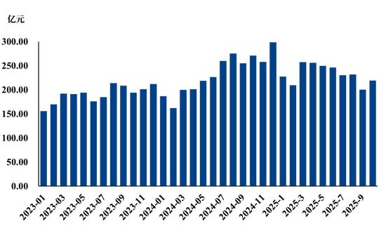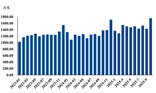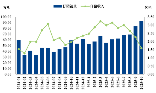 2025年10月,样本上市公司仔猪销售合计93.16万头,环比增长11.33%;根据涌益咨询统计,10月7kg仔猪月均价171元/头,环比下降36.67%;预估样本企业仔猪销售收入1.59亿元,环比下降29.65%。