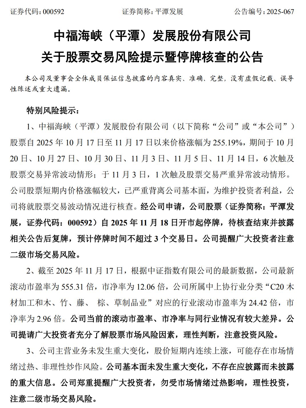 11月17日晚,(000592.SZ)公告称,公司股票自2025年10月17日至11月17日价格涨幅达255.19%,期间6次触及股票交易异常波动情形,1次触及股票交易严重异常波动情形。公司股票短期内价格涨幅较大,已严重背离公司基本面,为维护投资者利益,公司将对股票交易波动情况进行核查。