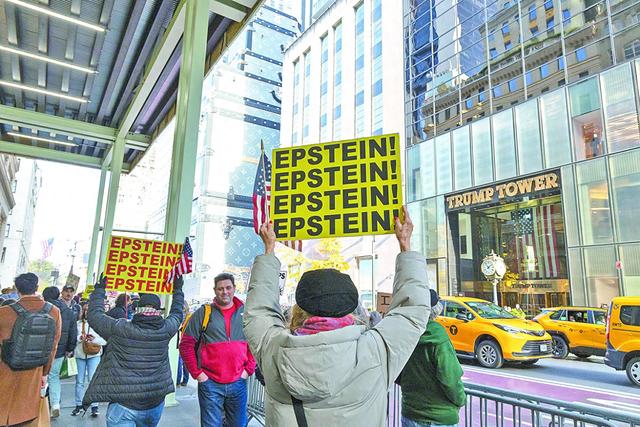 16日,示威者在纽约特朗普大厦外和平抗议,手持标语和横幅,要求“法治而非报复”“公开爱泼斯坦案文件”。(IC photo)