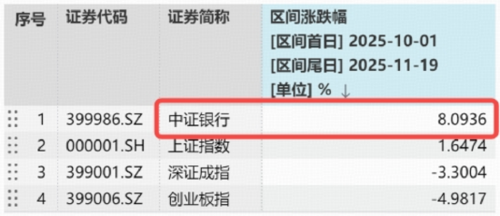10月以来,价值风格明显走强,其中银行表现突出。截至今日,区间累计涨超8%,在所有行业(中证全指二级行业)中排名第二,显著跑赢大盘,较创业板指超额13个百分点。
