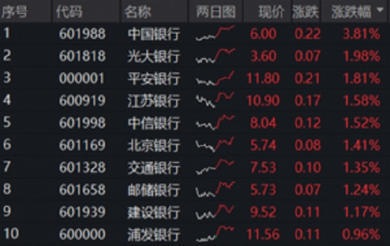 银行重回强势,盘面亮点频频。中国银行收盘大涨3.81%,创近1年来单日最大涨幅,刷新历史新高,也是近期继、后,又一家刷新股价高点的银行股。、涨近2%,、、等6股涨逾1%。