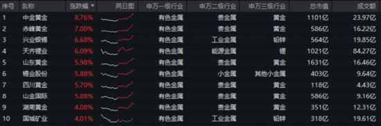 成份股方面,黄金龙头领衔上攻,涨超8%,涨逾7%,涨近6%; 锂业龙头亦有亮眼表现,涨超6%,、涨逾3%。