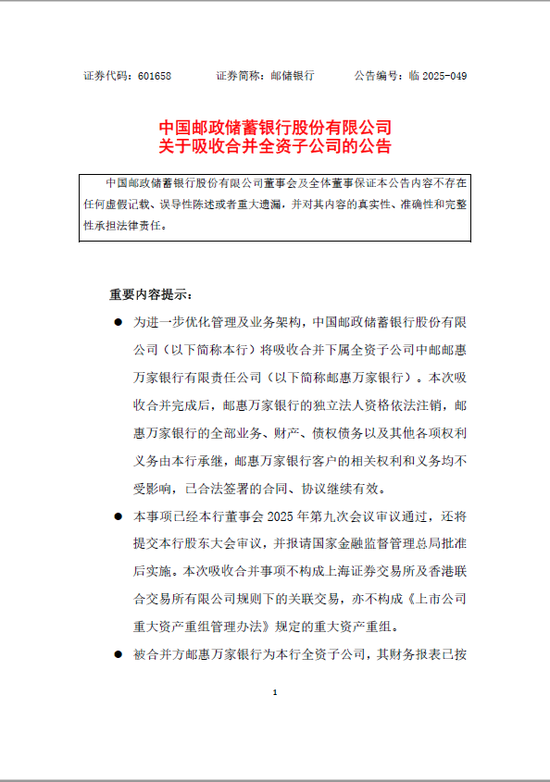 此外,公告还显示,被合并方邮惠万家银行为邮储银行全资子公司,其财务报表已按100%比例纳入邮储银行的合并报表范围,本次吸收合并不会对邮储银行的财务状况和经营成果产生实质性影响,也不会损害该行及全体股东的利益。
