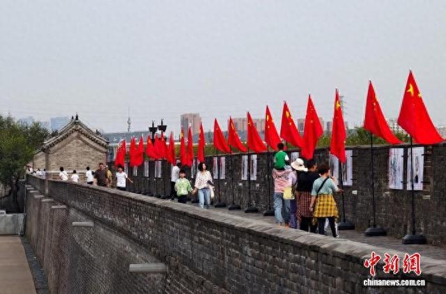 10月1日早上,登上宛平城城墙的游客们被“中国红”震撼——500面五星红旗沿城墙一圈整齐排列。许多游客手持国旗,在城墙上与这壮观的景象合影,镜头之下,是飘扬的旗帜、古老的城垣和人们脸上洋溢的自豪之情。