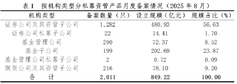 在5类机构中,证券公司及资管子公司8月私募资管产品备案数量、设立规模均排第一,共计备案1282只、设立规模480.93亿元,规模占比超五成。