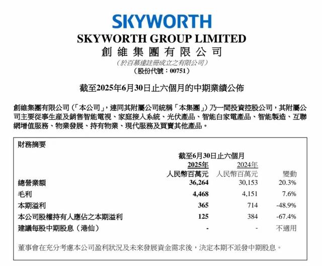 近日,创维集团披露2025年中期业绩显示,集团营业收入达362.64亿元,同比增长20.3%,创历史同期新高。