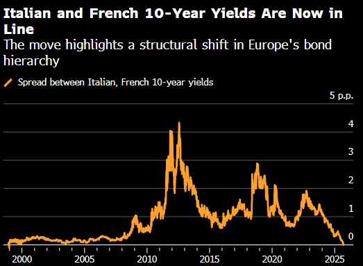 目前,意大利10年期国债收益率与德国国债之间的利差接近80个基点,不到梅洛尼在2022年上任时的三分之一。