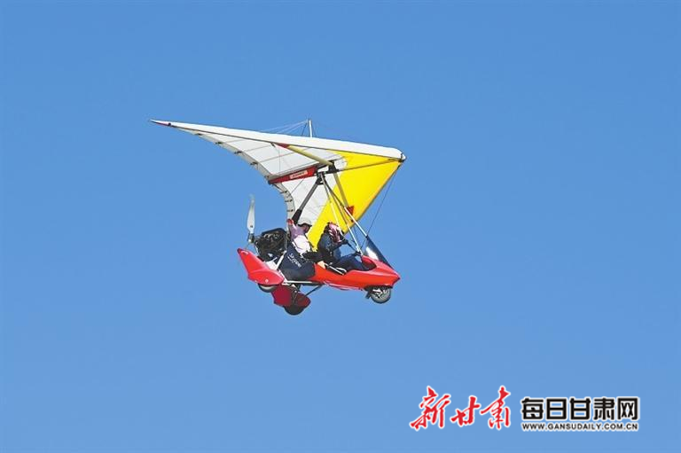 游客在敦煌市鸣沙山月牙泉景区乘坐动力滑翔机。新甘肃·甘肃日报通讯员 张晓亮