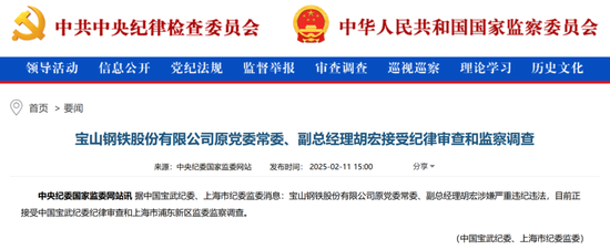 今年1月,宝钢股份发布公告称,胡宏因个人原因辞职。2月11日,中纪委官网通报称,宝山钢铁股份有限公司原党委常委、副总经理胡宏涉嫌严重违纪违法,接受中国宝武纪委纪律审查和上海市浦东新区监委监察调查。