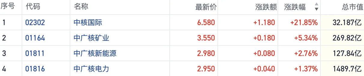 截至发稿,中核国际(02302.HK)涨近22%,中广核矿业(01164.HK)涨超5%,中广核新能源(01811.HK)等个股也有所跟涨。