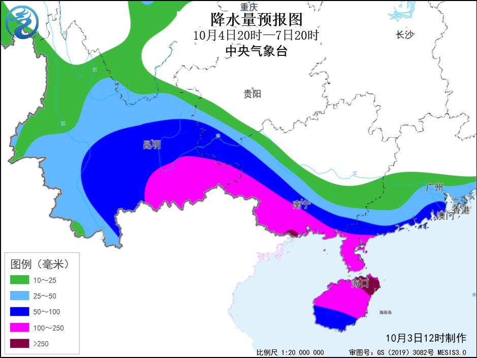 降雨预报:4日夜间至7日白天,华南南部和西部、云南等地自东向西有大到暴雨;其中,海南岛中北部、广东西南部、广西南部、云南东南部部分地区有大暴雨,海南岛东北部和广西沿海局地特大暴雨(累计降雨量100~160毫米,局地250~280毫米)。主要降雨时段广东、海南4日夜间至5日,广西5日至6日,云南6日至7日。