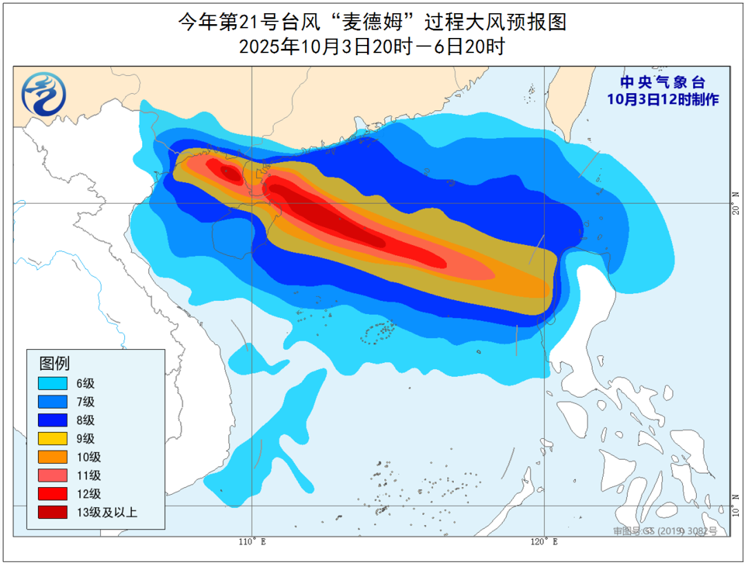 大风预报:3日夜间至6日白天,广东雷州半岛和中西部沿海、广西沿海、海南岛及沿海、西沙群岛、中沙群岛、黄岩岛附近海域将有6~8级风,南海中北部、琼州海峡、北部湾中北部有9~11级风,“麦德姆”中心经过的附近海域或地区风力可达12~14级、阵风15~17级。
