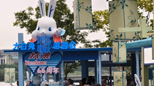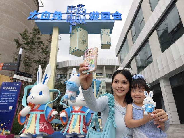 国庆长假,“大白兔唐韵中秋”游园会在徐汇滨江西岸梦中心开幕。“大白兔”换上汉服,化身“唐韵中秋”形象大使,与非遗剪纸风格的艺术装置《月满》展亭相映成趣。