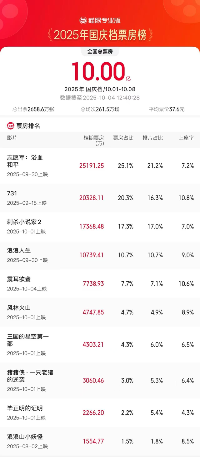 据网络平台数据,截至10月4日12时40分,2025年国庆档档期票房破10亿,《志愿军:浴血和平》《731》《刺杀小说家2》分列前三位。
