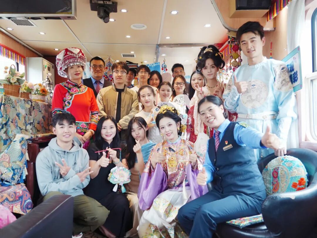 “旅客朋友们,欢迎乘坐本趟列车,中秋佳节将至,我们在2号餐车准备了特色活动,诚邀大家共庆佳节!”列车长李文雯的声音通过广播传遍车厢。随即《纳西三部曲》旋律响起——身着绚丽民族服饰的列车员们,拉着周围旅客一同跳起纳西族舞蹈,欢快的节奏瞬间点燃车厢气氛。