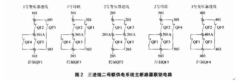 三进线二母联供电系统的联锁电路比较复杂,5个回路主断路器相互关联,反复联锁。