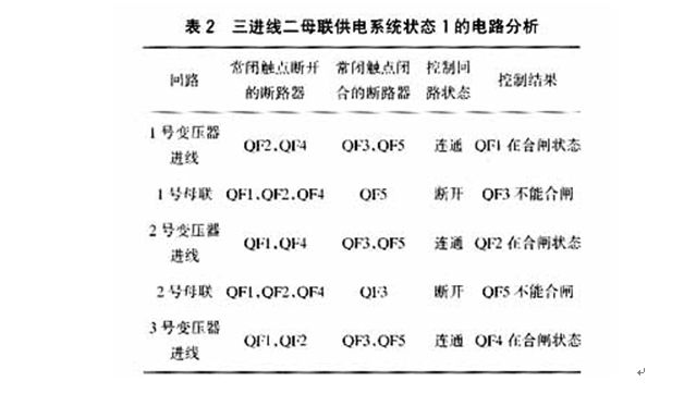 在状态1,即QF1,QF2和QF4合闸而 QF3和QF5分闸时,其电路分析见表2。经过表2分析可知,在状态1时,QF3和QF5不能合闸,此时由1~3号变压器供电。