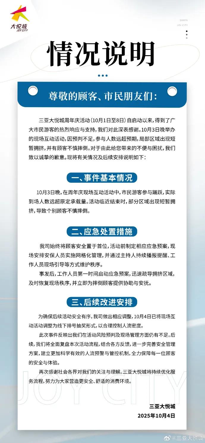 10月4日晚10时许,三亚大悦城发布“情况通报”称,3日晚举办的现场互动活动,因预判不足,参与人数远超预期,局部区域出现短时拥挤,并有顾客不慎摔倒。“对于由此给您带来的不便与困扰,我们致以诚挚的歉意。”