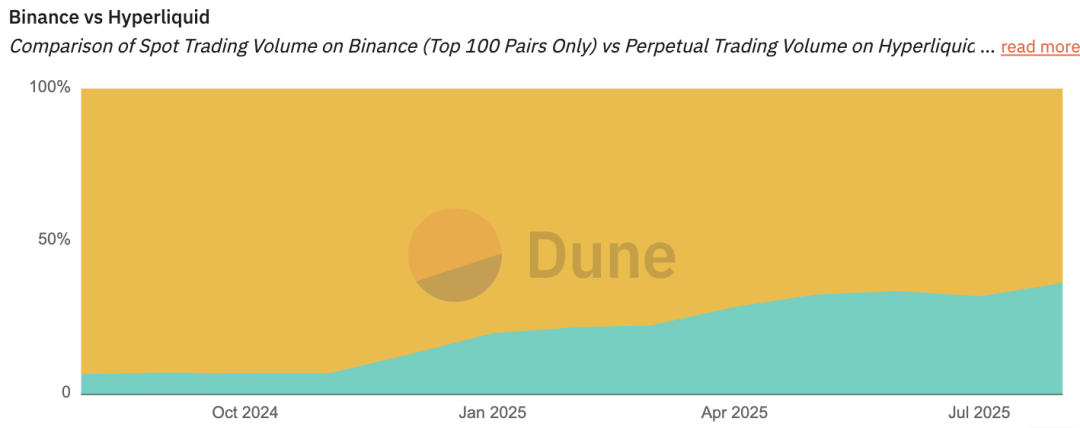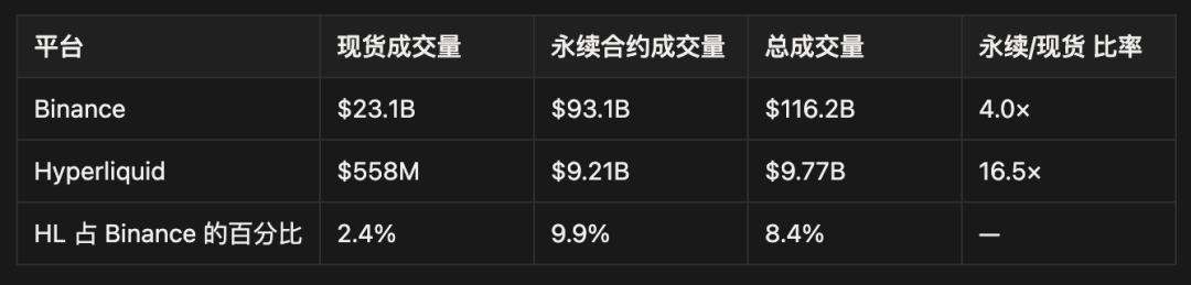然而,将现货交易量与永续合约交易量直接比较,就像比较苹果和橘子。如果我们想要清晰区分币安(Binance)和Hyperliquid(HL)在现货与永续合约市场的实际份额,可以看到以下情况: