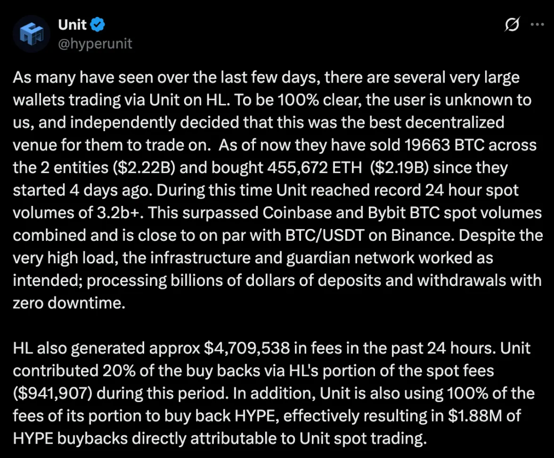 Unit 项目通过提供更原生的现货交易体验,有力地推动了 HIP-2 的采用。本质上,Unit 是一个多签钱包,它允许交易者索引原生链并在 Hyperliquid 上进行无需许可的交易。