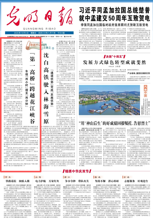 10月5日,《光明日报》头版刊发《“第一高桥”跨越花江峡谷车程“两小时”缩至“两分钟”》。