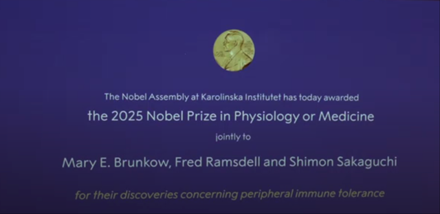 2025年诺贝尔生理学或医学奖授予玛丽·E·布伦考、弗雷德·拉姆斯德尔和萨库·萨卡古奇,以表彰他们在外周免疫耐受领域的重要发现。