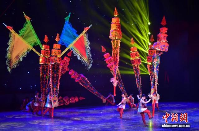 10月6日晚,第二十届中国吴桥国际杂技艺术节“国际杂技盛典”在河北石家庄精彩上演。全球顶尖杂技力量同台献艺,为观众带来一场无与伦比的视觉盛宴。图为中幡表演。中新社记者 翟羽佳摄