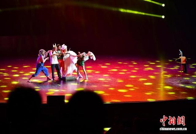 10月6日晚,第二十届中国吴桥国际杂技艺术节“国际杂技盛典”在河北石家庄精彩上演。全球顶尖杂技力量同台献艺,为观众带来一场无与伦比的视觉盛宴。图为观众(黑裤)上台与演员互动表演。中新社记者 翟羽佳摄