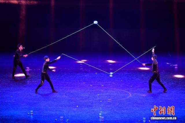 10月6日晚,第二十届中国吴桥国际杂技艺术节“国际杂技盛典”在河北石家庄精彩上演。全球顶尖杂技力量同台献艺,为观众带来一场无与伦比的视觉盛宴。图为中国台湾空竹表演。中新社记者 翟羽佳摄
