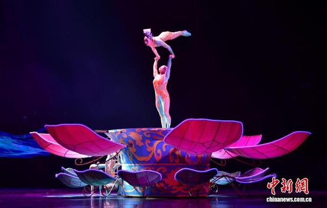 10月6日晚,第二十届中国吴桥国际杂技艺术节“国际杂技盛典”在河北石家庄精彩上演。全球顶尖杂技力量同台献艺,为观众带来一场无与伦比的视觉盛宴。图为顶碗表演。中新社记者 翟羽佳摄