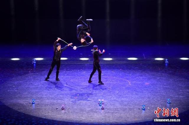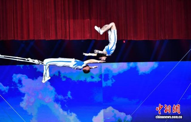 10月6日晚,第二十届中国吴桥国际杂技艺术节“国际杂技盛典”在河北石家庄精彩上演。全球顶尖杂技力量同台献艺,为观众带来一场无与伦比的视觉盛宴。图为朝鲜空中飞人表演。中新社记者 翟羽佳摄
