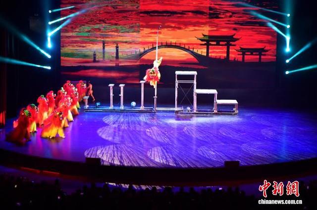 10月6日晚,第二十届中国吴桥国际杂技艺术节“国际杂技盛典”在河北石家庄精彩上演。全球顶尖杂技力量同台献艺,为观众带来一场无与伦比的视觉盛宴。图为祥狮跃九州表演。中新社记者 翟羽佳摄