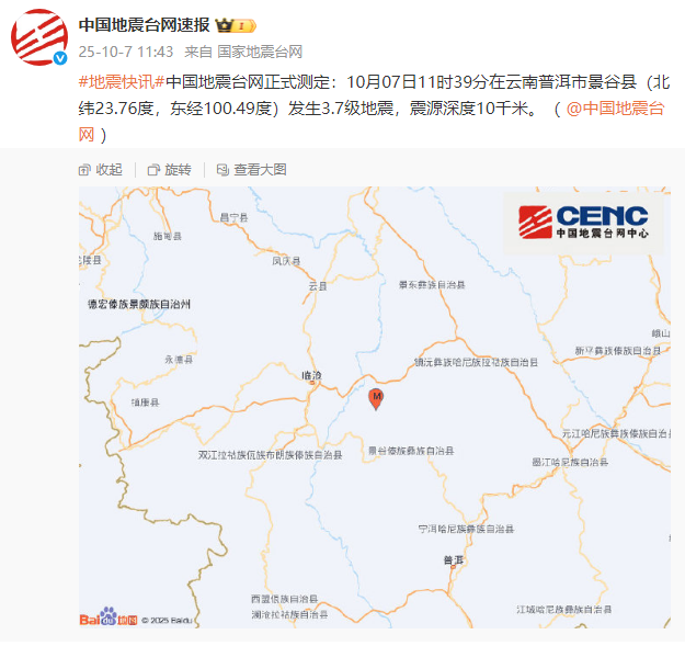 中国地震台网正式测定:10月07日11时39分在云南普洱市景谷县(北纬23.76度,东经100.49度)发生3.7级地震,震源深度10千米。