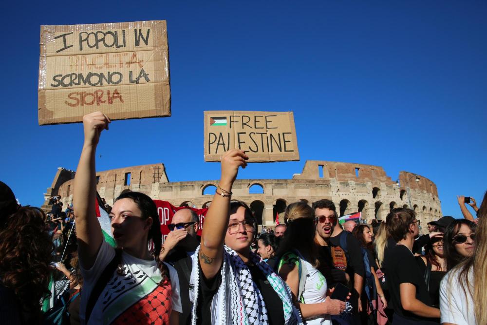 10月4日,在意大利罗马,游行队伍向斗兽场行进。连日来,意大利多地爆发大规模抗议活动,罗马、米兰等地数万人走上街头,声援巴勒斯坦。新华社记者 李京 摄