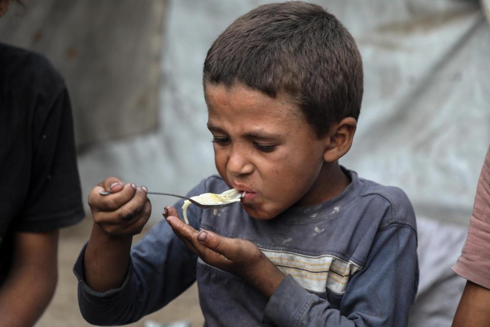 7月29日,在加沙城的一个帐篷里,一名男孩在进食。当地许多家庭仅靠少许入境加沙地带的人道主义援助物资维系生存。新华社发(里泽克·阿卜杜勒 贾瓦德 摄)