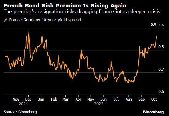 这些分歧观点凸显出法国债券市场面临的日益严峻挑战,此前因难以制定出能安抚反对派政党的预算草案,塞巴斯蒂安·勒科尔尼被迫辞职。他是两年来法国第五任总理。