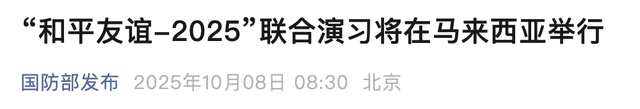 10月中下旬,“和平友谊-2025”联合演习将位马来西亚及其附近海域举行。此次联演以“人道主义救援减灾与海上安全”为课题,中国和马来西亚两国军队将派出多军兵种力量开展联合实兵演练,邀请其他东盟国家派员观摩。这是该系列联演第6次举行,旨在深化中国与东南亚国家军队务实合作,提升共同应对非传统领域安全威胁、维护地区和平稳定的能力。