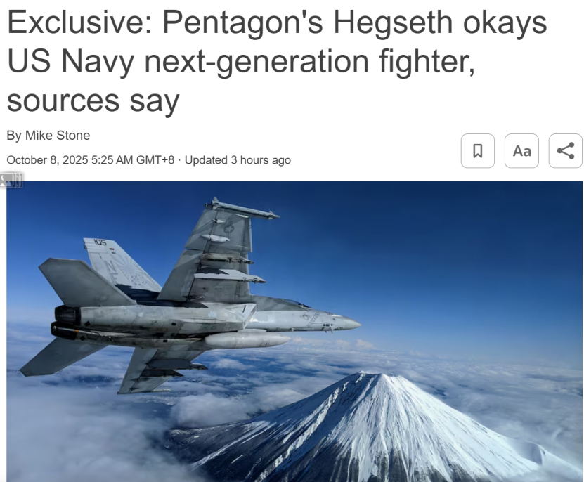 有美国官员和知情人士表示,美国国防部长赫格塞思上周五做出了推进选择的决定。一名知情人士表示,美国海军最早可能在本周公布战机制造竞标的获胜者。但消息人士称,过去,最后一刻的障碍曾延误美国海军战机的研发,这种情况也有可能再次发生。美国海军和五角大楼未回应置评请求。