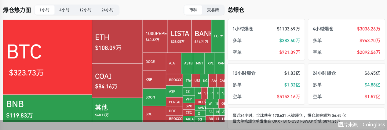 避险情绪下,被拥趸视为“数字黄金”的比特币,近期和黄金在价格走势上呈现了一定的一致性。值得注意的是,在比特币价格的大幅波动下,市场爆仓同样呈现加剧态势。根据Coinglass数据,截至10月8日17时30分的过去24小时里,全球共有170631人被爆仓,爆仓总金额为6.45亿美元,约合46亿元人民币,其中最大单笔爆仓单交易金额为874.26万美元。