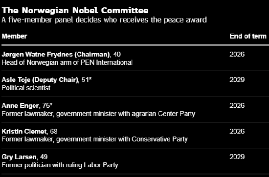 挪威诺贝尔委员会的成员任期六年且可连任。为了消除人们对挪威政客影响诺决策的看法,在任议员自1977年起被排除在了委员会之外。