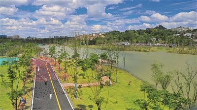 图为10月8日,游客在国庆中秋假期开园的花溪湖公园游玩。