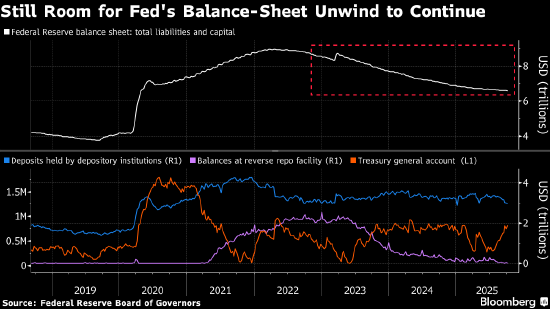 在会议纪要中,美联储系统公开市场账户副经理Julie Remache指出,若按当前速度继续缩减资产负债表,美联储的证券持有规模预计到3月底将降至略超6万亿美元。因此,Remache预计到2026年3月底,银行体系准备金规模将接近2.8万亿美元区间。