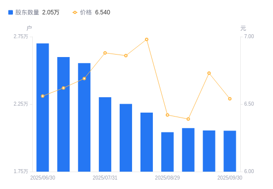 10月9日消息,数据显示,截至2025年9月30日,A股股东总户数为2.05万户,较上期(2025年9月19日)减少18户,降幅0.09%。公司最新A股总股本为4.77亿股,其中流通A股3.43亿股,户均持有流通A股数量为1.67万股,较上期增加14.62股,增幅0.09%;户均持流通A股市值10.92万元,较上期减少3072.98元,降幅2.74%。