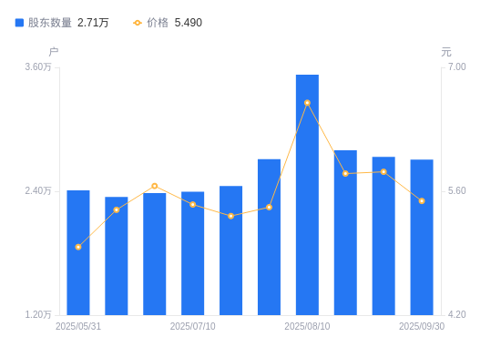 10月9日消息,数据显示,截至2025年9月30日,A股股东总户数为2.71万户,较上期(2025年9月20日)减少259户,降幅0.95%。公司最新A股总股本为4.68亿股,其中流通A股4.67亿股,户均持有流通A股数量为1.72万股,较上期增加163.47股,增幅0.96%;户均持流通A股市值9.47万元,较上期减少4739.92元,降幅4.77%。